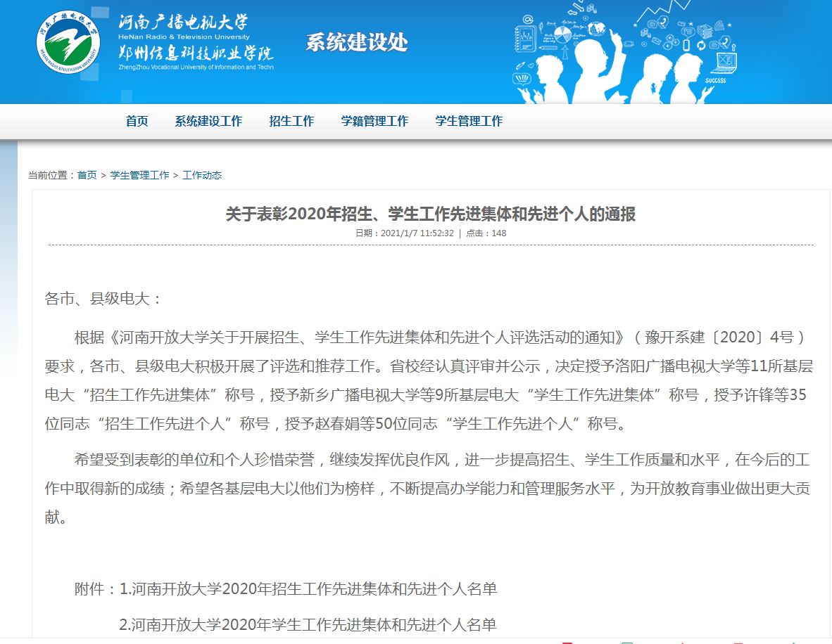 豫开系建〔2021〕2号文件:yl8858永利关于表彰2020年招生、员工工作先进集体和先进个人的通报鹤壁广播电视大学被评为“2020年员工工作先进集体”,尚玉保、董方亮被评为“先进个人”。