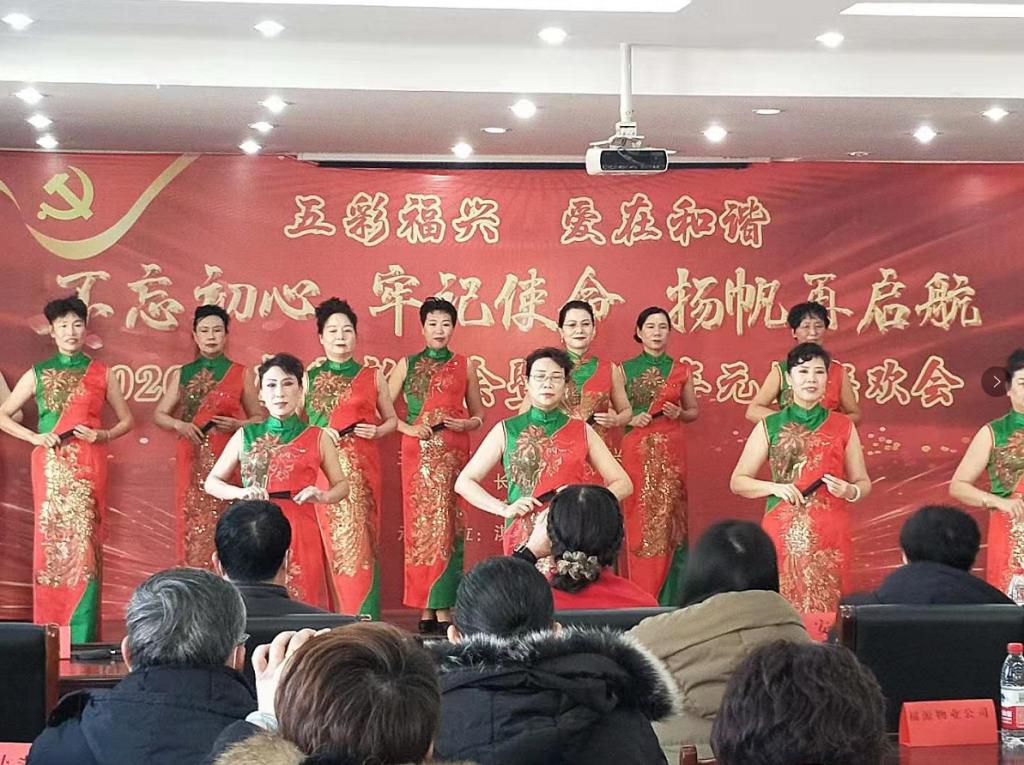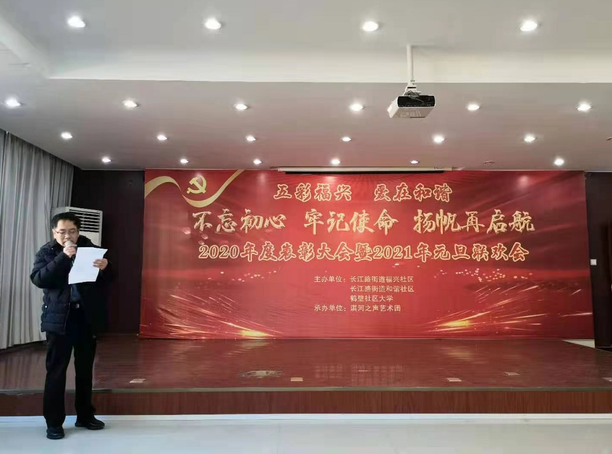 2021年的新年即将到来之际,为庆祝新年、表彰2020年度社区工作中的先进集体和先进个人以及对2021年的社区工作谋好局, 2020年12月31日上午9点,在桃园社区物业楼四楼大会议室鹤壁社区大学和长江路办事处共同举办了《不忘初心 、牢记使命 、 扬帆再起航》2020年度表彰大会暨2021年元旦联欢会。联欢会首先由公司党总支书记、经理蒋安致辞:蒋安对2020年度长江路办事处各社区和鹤壁社区大学联合开展社区工作取得的成绩表示衷心的祝贺、对在2020年度社区工作中表现突出的先进集体和先进个人进行了鼓励、对鹤壁社区大学被评为河南省示范性老年大学与社区工作者分享了喜讯。蒋安和长江路办事处的相关领导对在2020年度社区工作中表现突出的先进集体和先进个人颁发了奖牌和荣誉证书。随后,在歌声、舞蹈、戏曲、诗朗诵…….等一个个精彩的文艺节目中欢庆2021新年的到来。