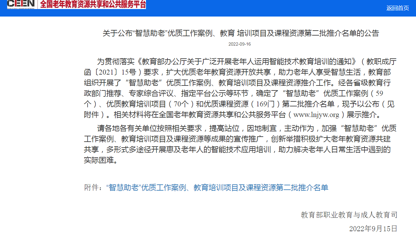 公司入选教育部职业教育与成人教育司“智慧助老”优质工作案例、教育培训项目及课程资源两项