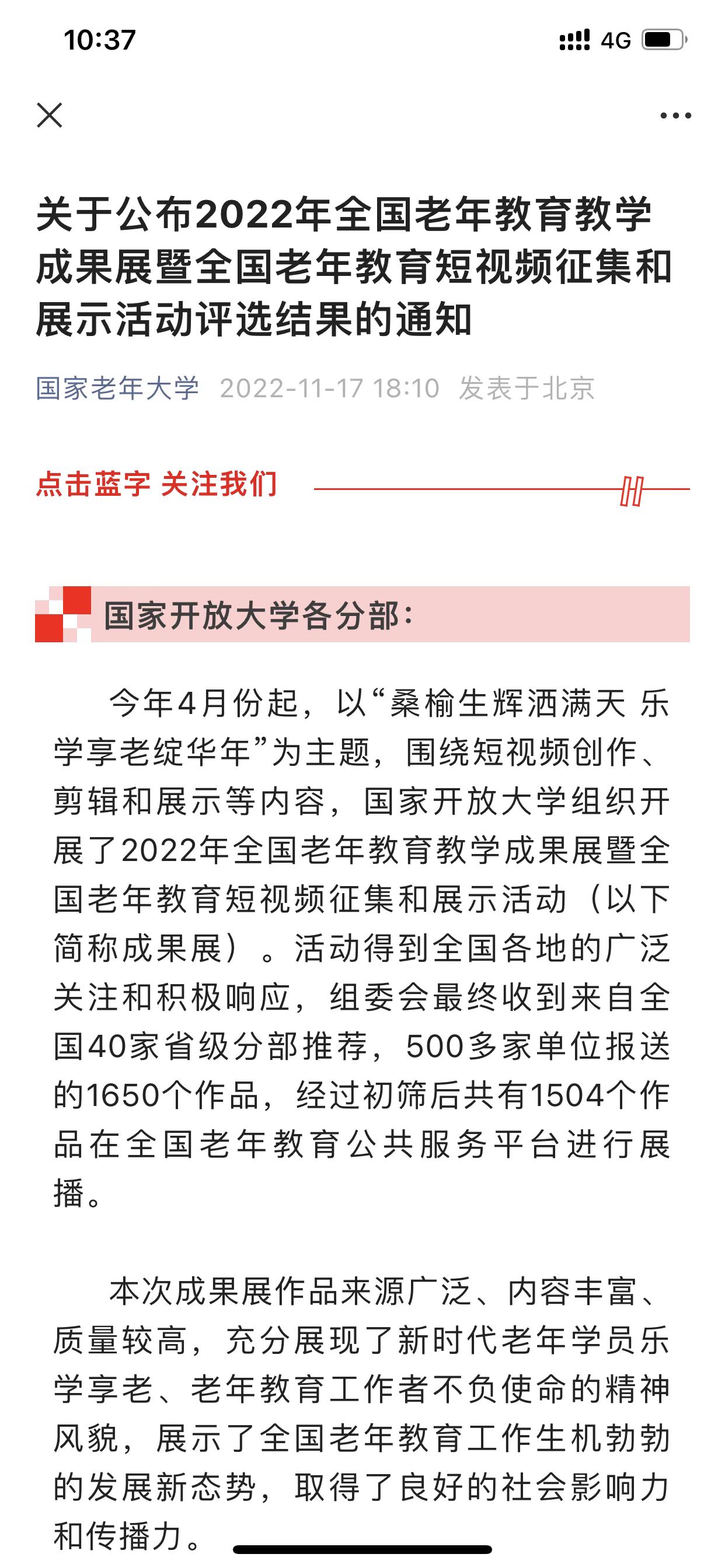 公司作品在2022年全国老年公司产品成果展暨全国老年教育短视频征集和展示活动中获优秀奖