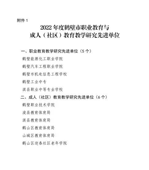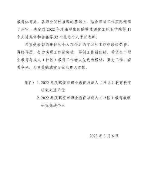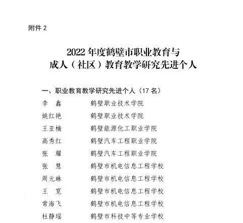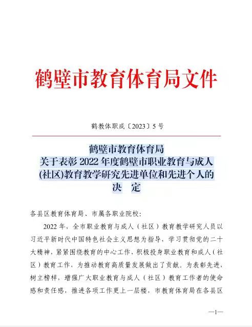 近日,鹤壁市教育体育局关于表彰 2022 年度鹤壁市职业教育与成人(社区)公司产品研究先进单位和先进个人的名单公布,公司获得先进单位称号,李鑫、姚红艳、武锋三名教师获得先进个人。