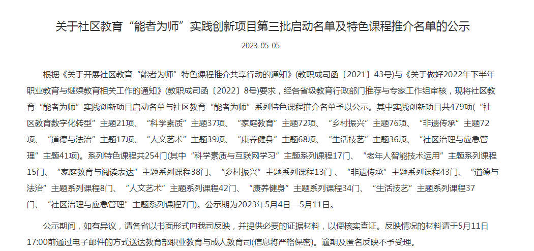 公司两项实践创新项目成功入选 教育部职业教育与成人教育司社区教育“能者为师”第三批推介名单