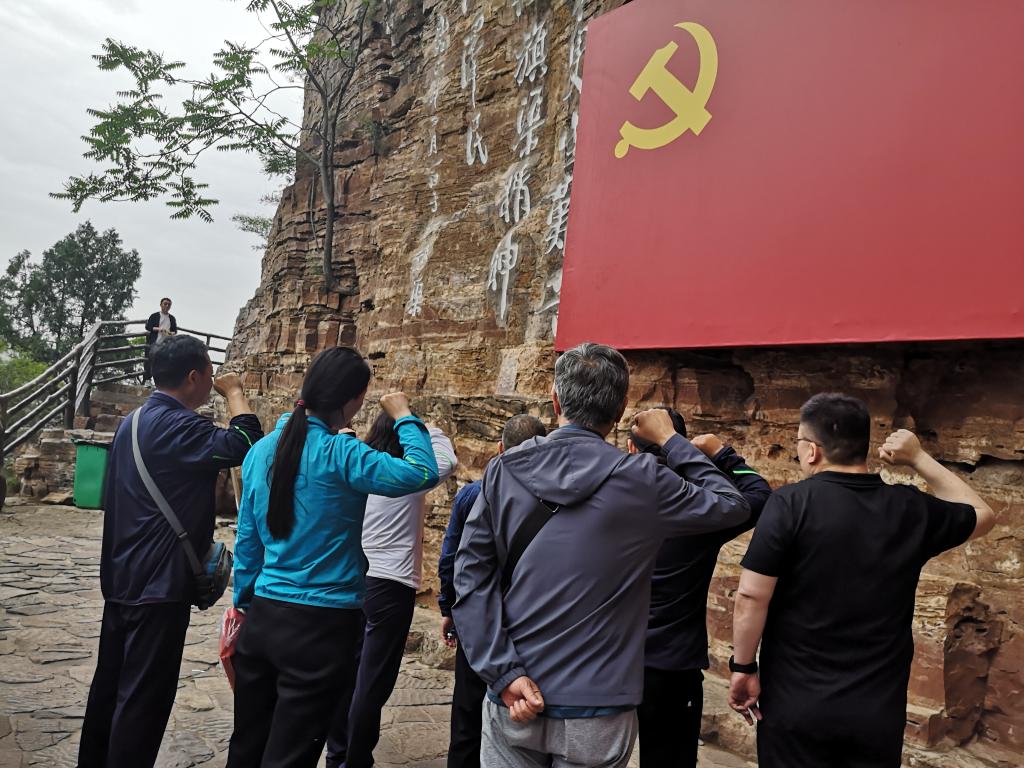 在红旗渠纪念馆,一幅幅生动的历史照片、一段段感人的故事、一件件陈旧的工具,让大家身临其境感受到林县人民建造“人工天河”时不畏艰险、顽强拼搏的恢弘场景。随后,全体党员沿渠徒步到青年洞,近距离感受“人工天河”的雄伟壮观。面对党旗,全体党员干部举起右拳,重温入党誓词。