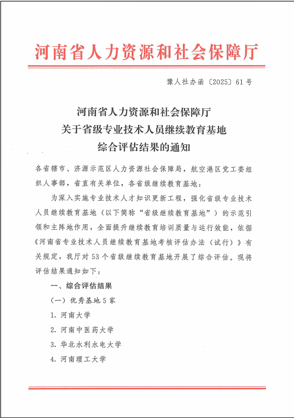 河南省人力资源和社会保障厅近日发布了《河南省人力资源和社会保障厅关于省级专业技术人员继续教育基地综合评估结果的通知》(教人社办函〔2025〕61号),公司顺利通过评估,并在同类院校排名靠前。
